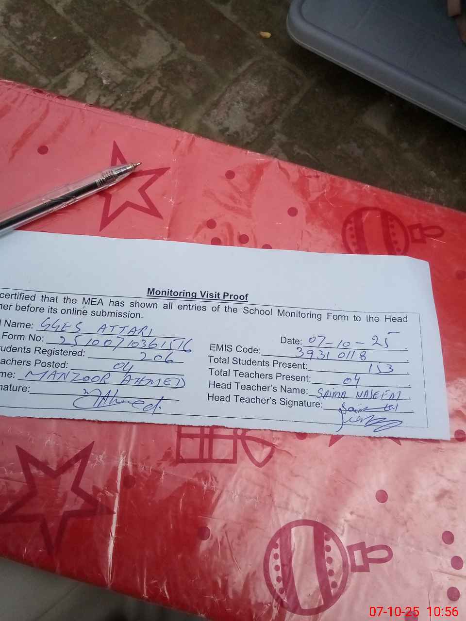 | Attendance Register | Head Teacher | MEA with School | Visit Proof |