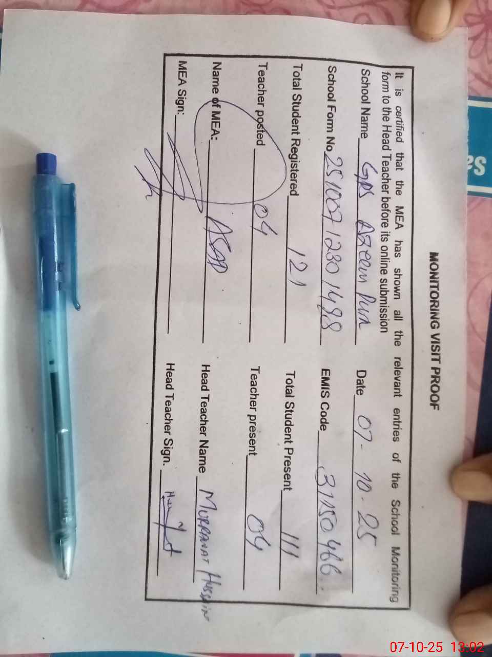 | Attendance Register | Head Teacher | MEA with School | Visit Proof |