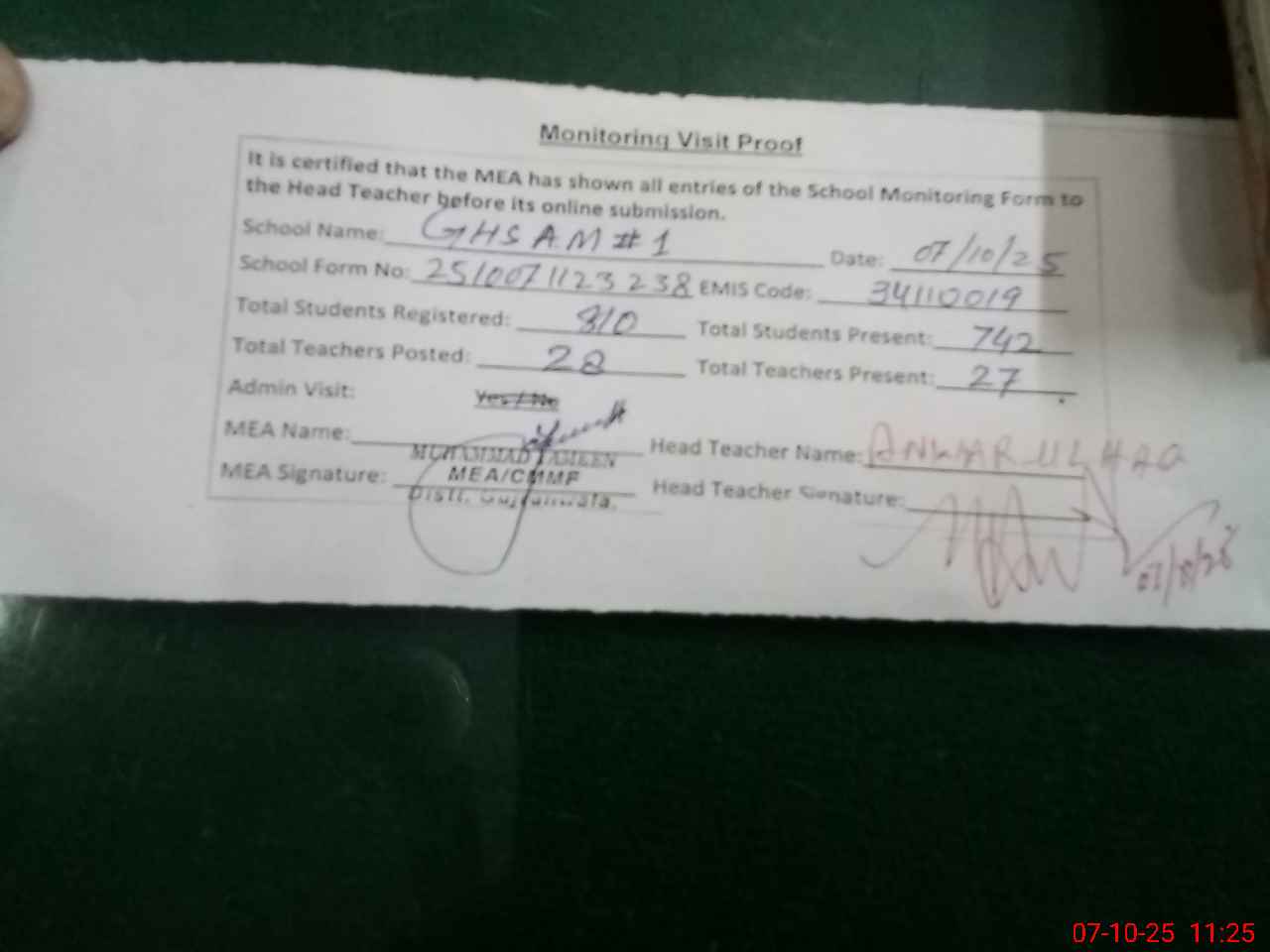 | Attendance Register | Head Teacher | MEA with School | Visit Proof |