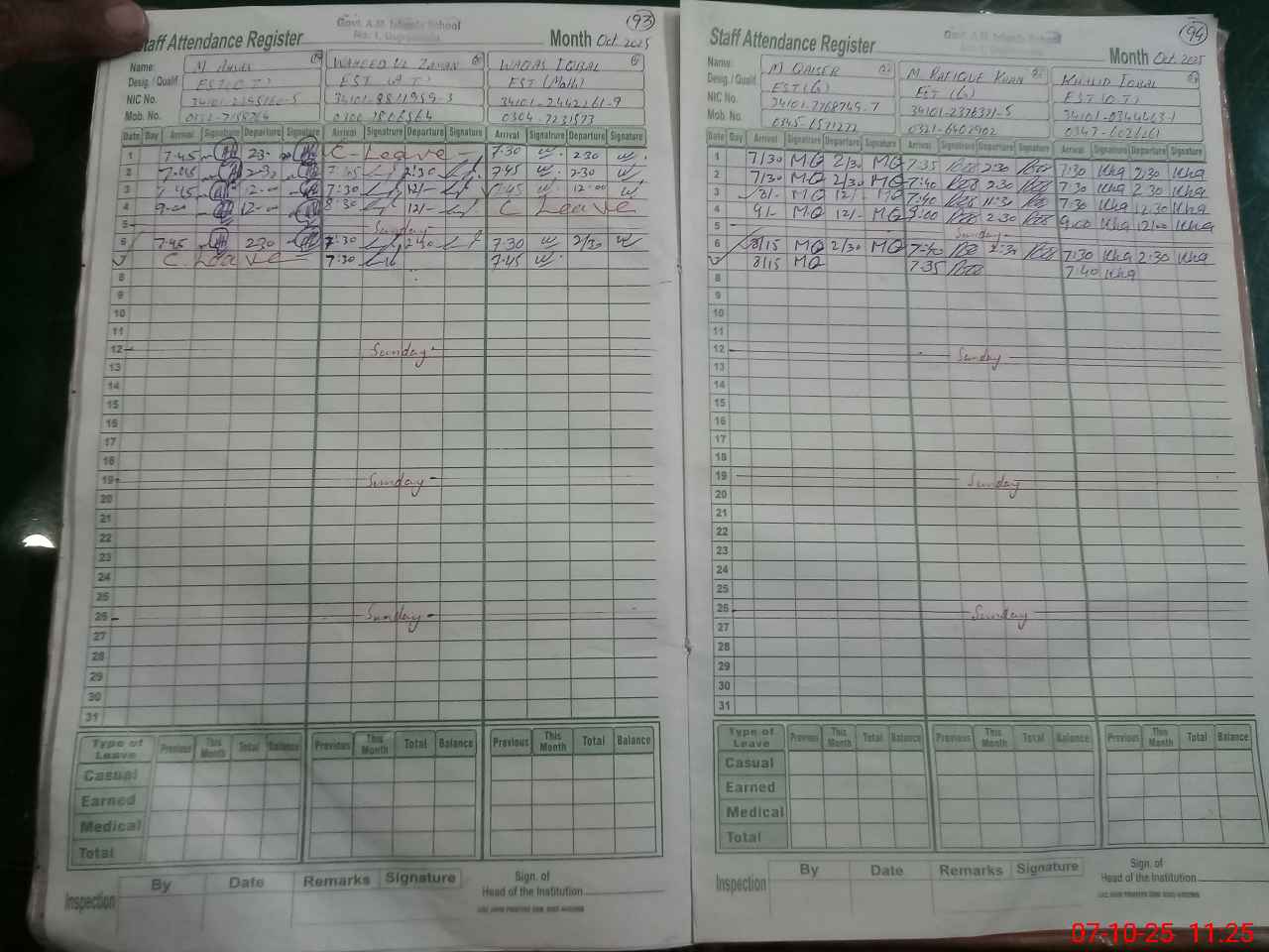 | CNIC | Full Name | Designation | R/C | Absence during last cal. month |