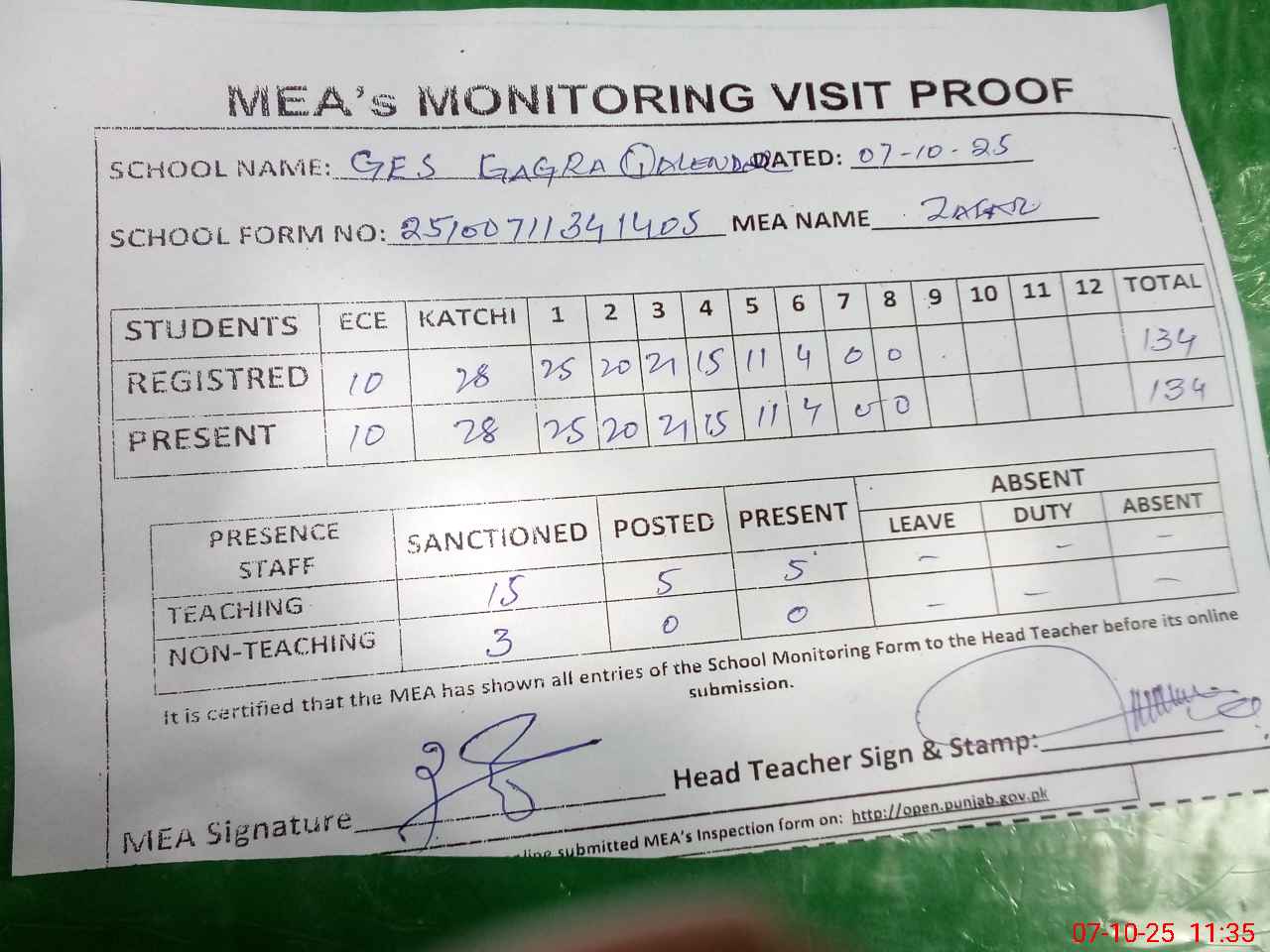 | Attendance Register | Head Teacher | MEA with School | Visit Proof |