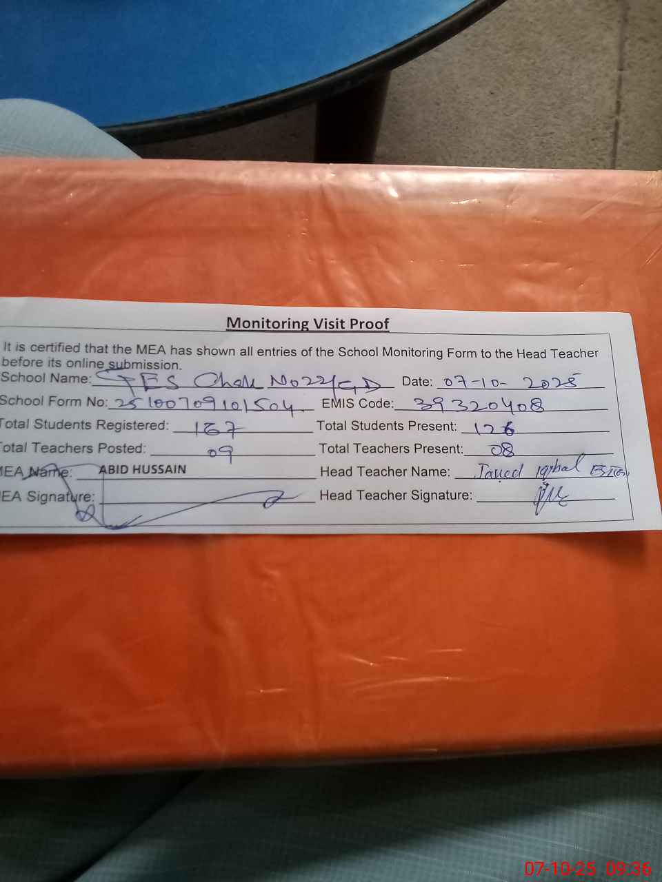| Attendance Register | Head Teacher | MEA with School | Visit Proof |