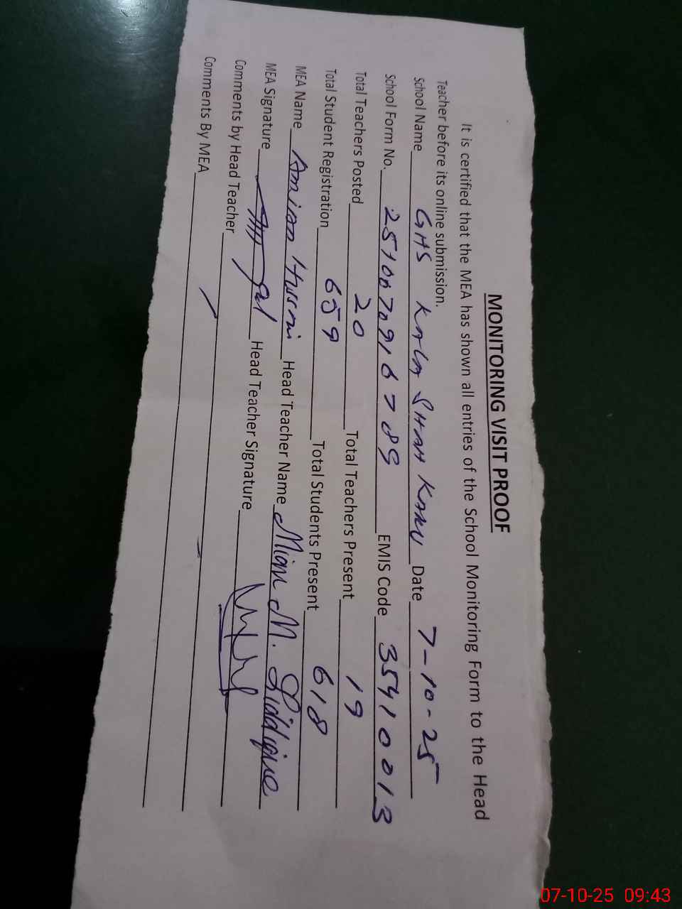 | Attendance Register | Head Teacher | MEA with School | Visit Proof |