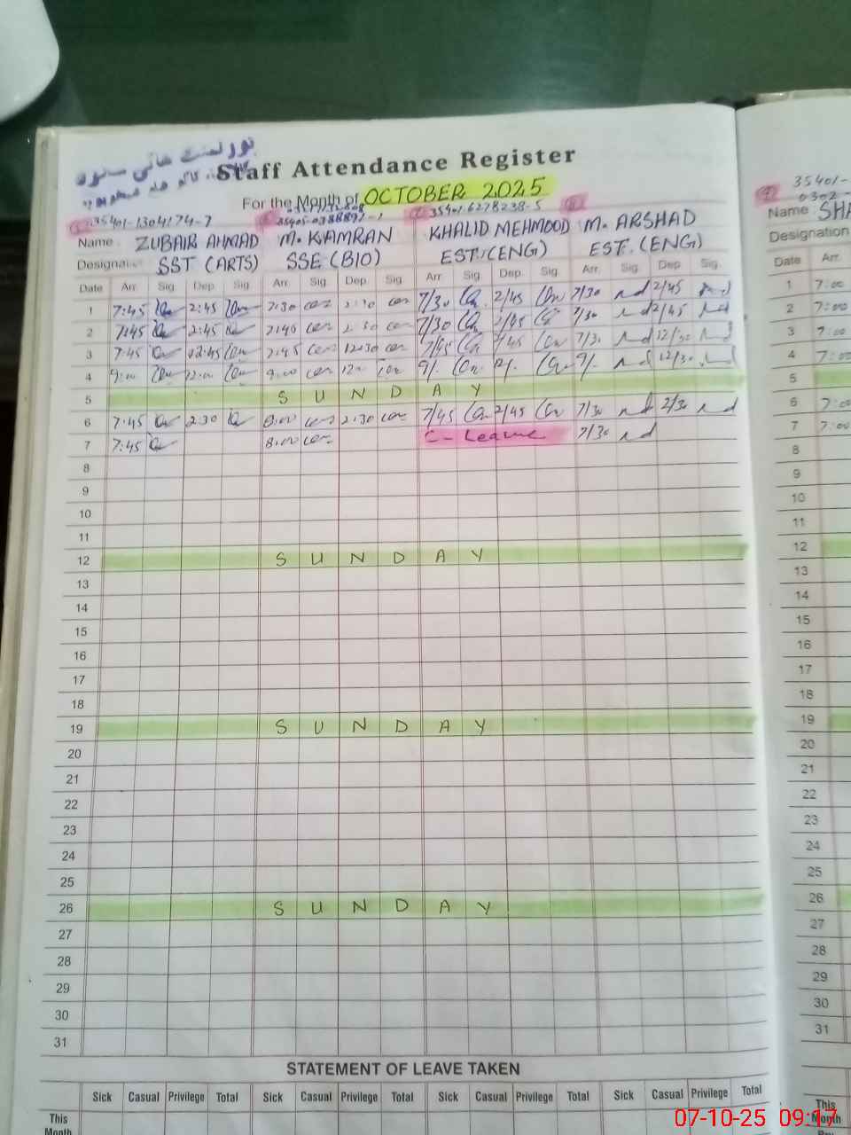 | CNIC | Full Name | Designation | R/C | Absence during last cal. month |