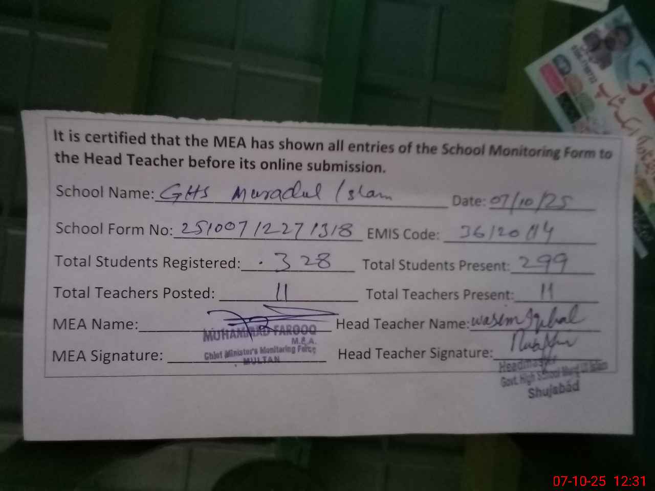 | Attendance Register | Head Teacher | MEA with School | Visit Proof |