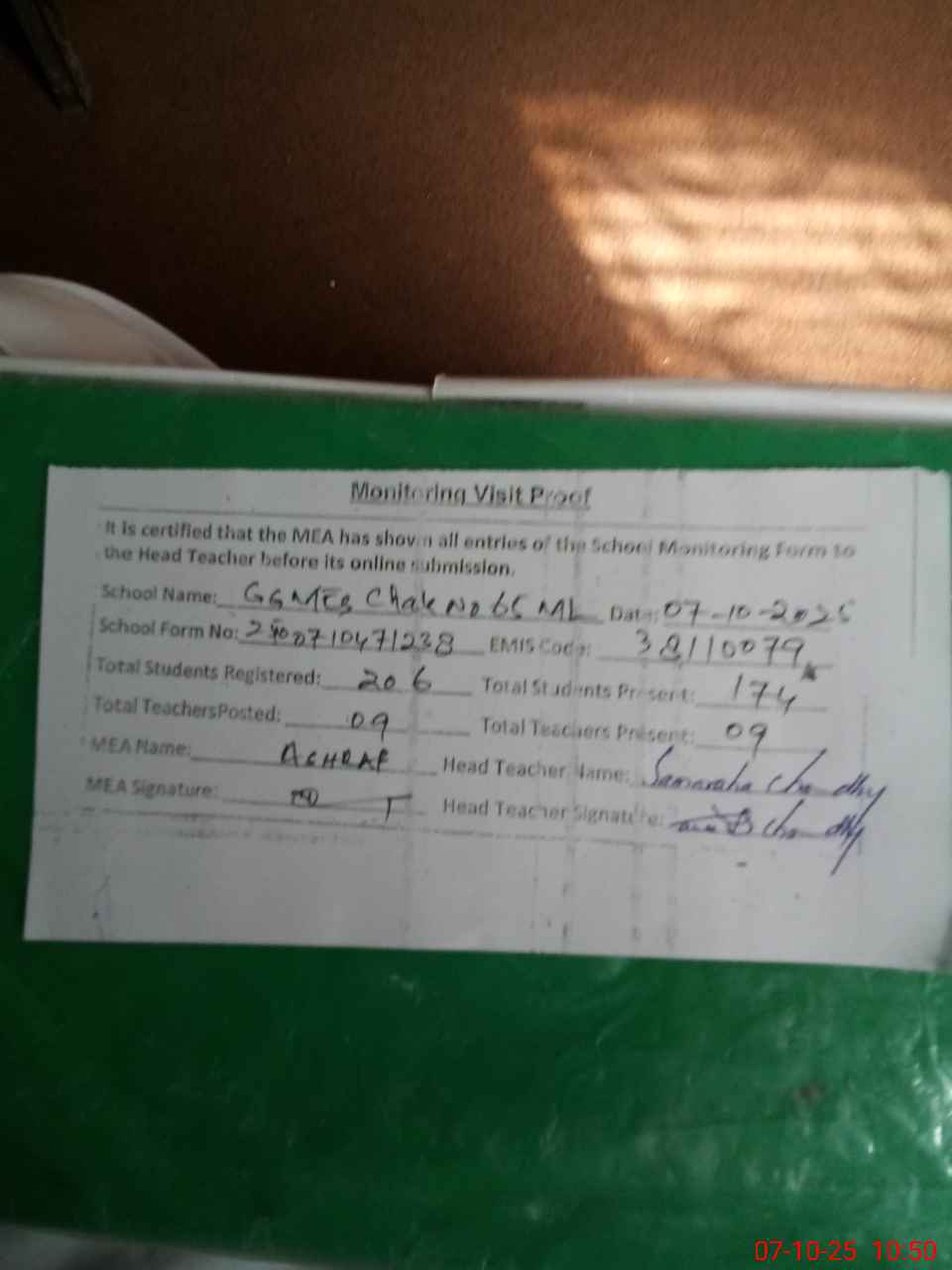 | Certified that this School was Inspected by the Undersigned MEA/DMO Today and the Information Stated Above is as Per Record. | |||||