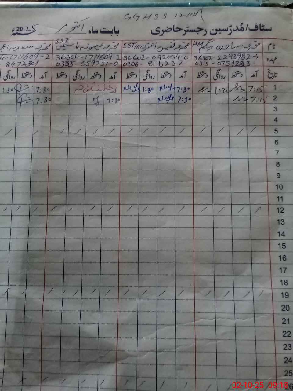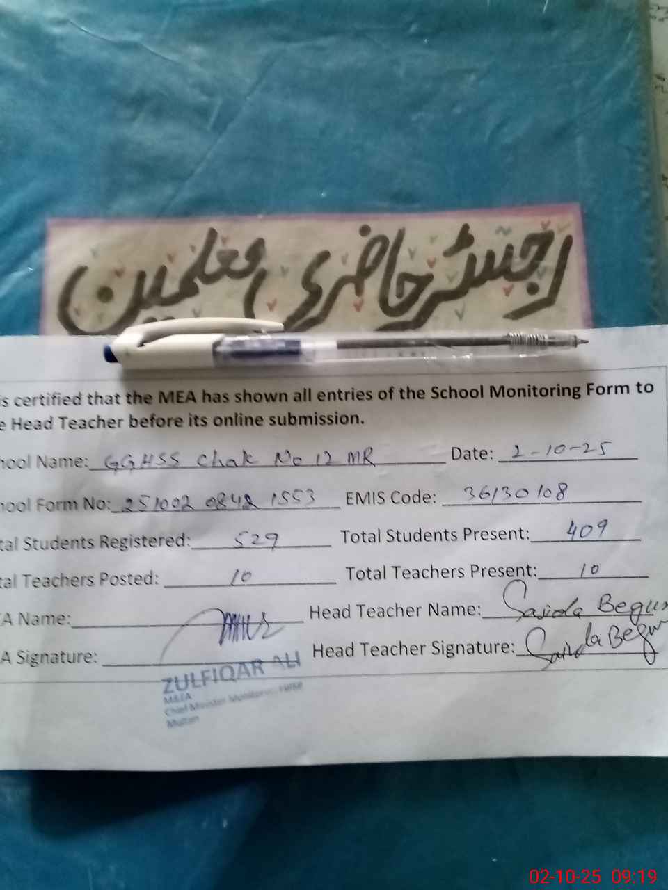| EMIS Code: 36130108 | Name of School: GGHSS CHAK NO. 12-MR SADDAR MULTAN | |||