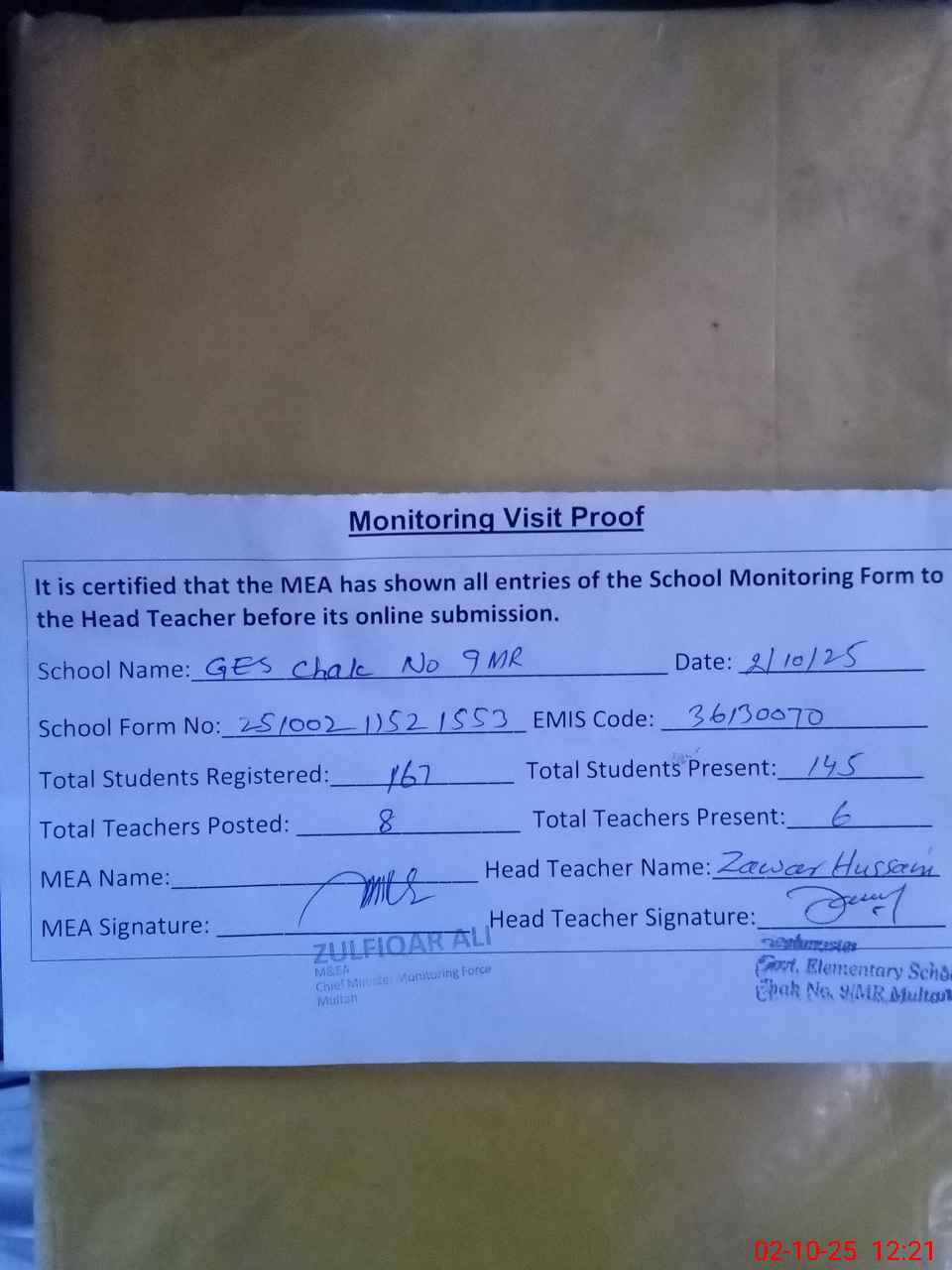 | EMIS Code: 36130070 | Name of School: GES CHAK NO 9-MR P/O MUKHDOOM RASHEED | |||