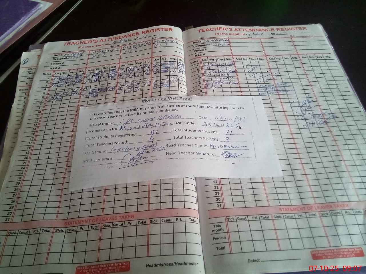 | Attendance Register | Head Teacher | MEA with School | Visit Proof |
