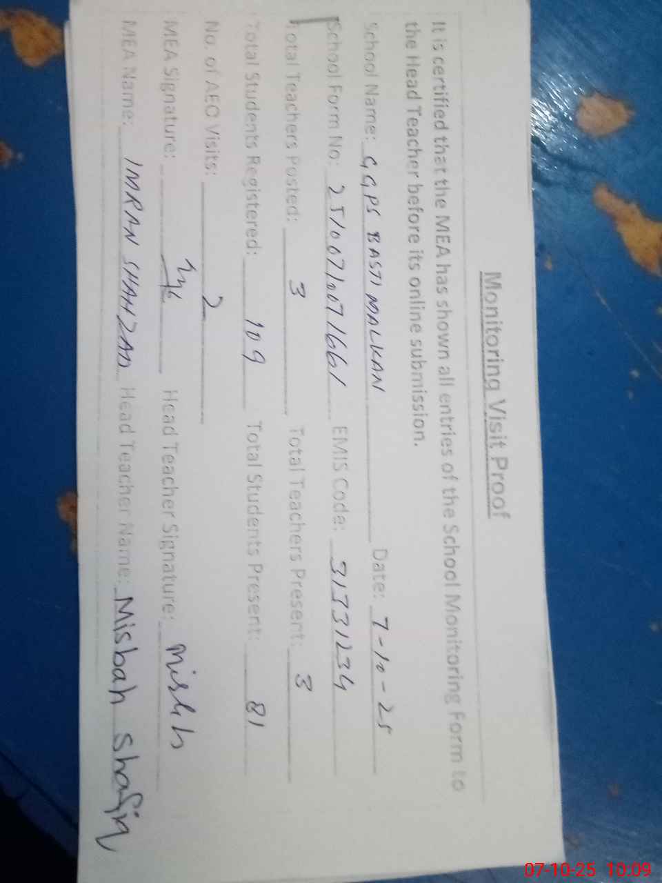 | Monitoring Date: 07-10-2025 | Start Time: 07-10-2025 09:47 AM | End Time: 07-10-2025 10:10 AM | Name of MEA: Im**** Sh**** | |
