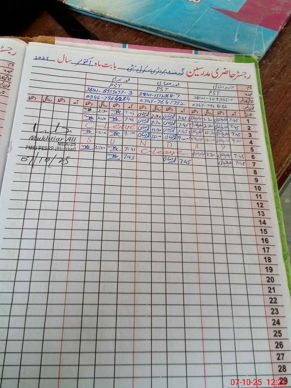 | CNIC | Full Name | Designation | R/C | Absence During Last Calender Month |