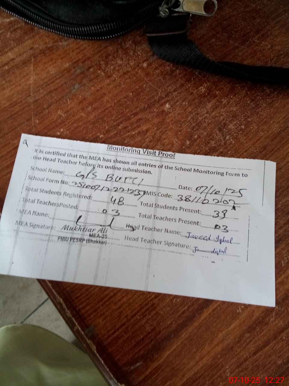 | Certified that this School was Inspected by the Undersigned MEA/DMO Today and the Information Stated Above is as Per Record. | |||||