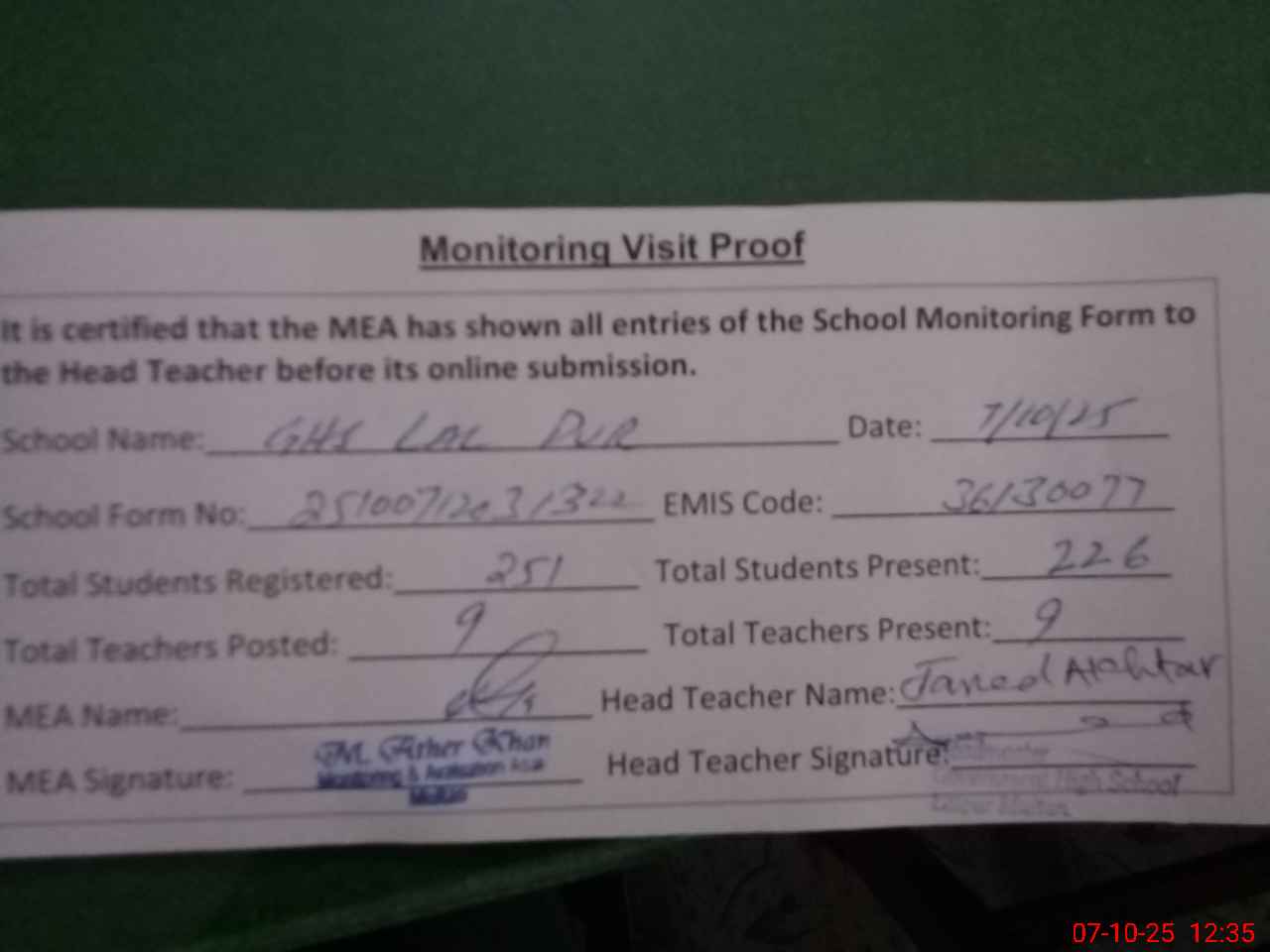 | Certified that this School was Inspected by the Undersigned MEA/DMO Today and the Information Stated Above is as Per Record. | |||||