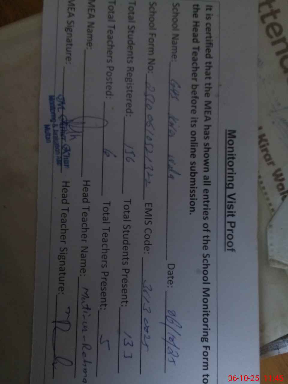| Attendance Register | Head Teacher | MEA with School | Visit Proof |