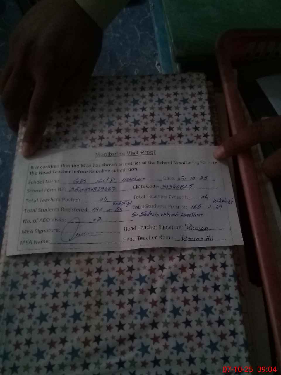 | Attendance Register | Head Teacher | MEA with School | Visit Proof |