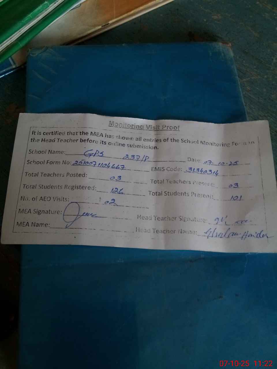 | Attendance Register | Head Teacher | MEA with School | Visit Proof |