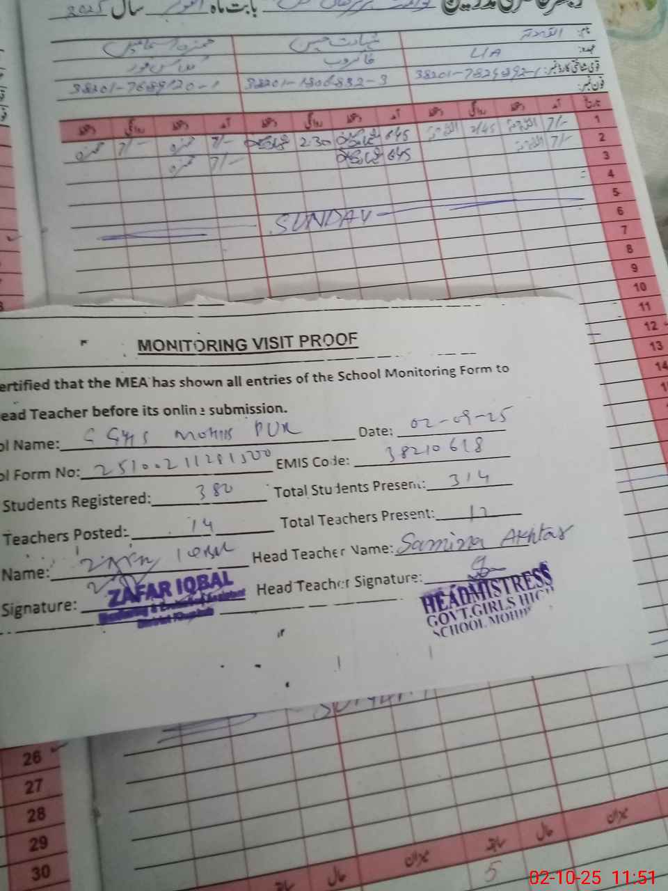 | Attendance Register | Head Teacher | MEA with School | Visit Proof |