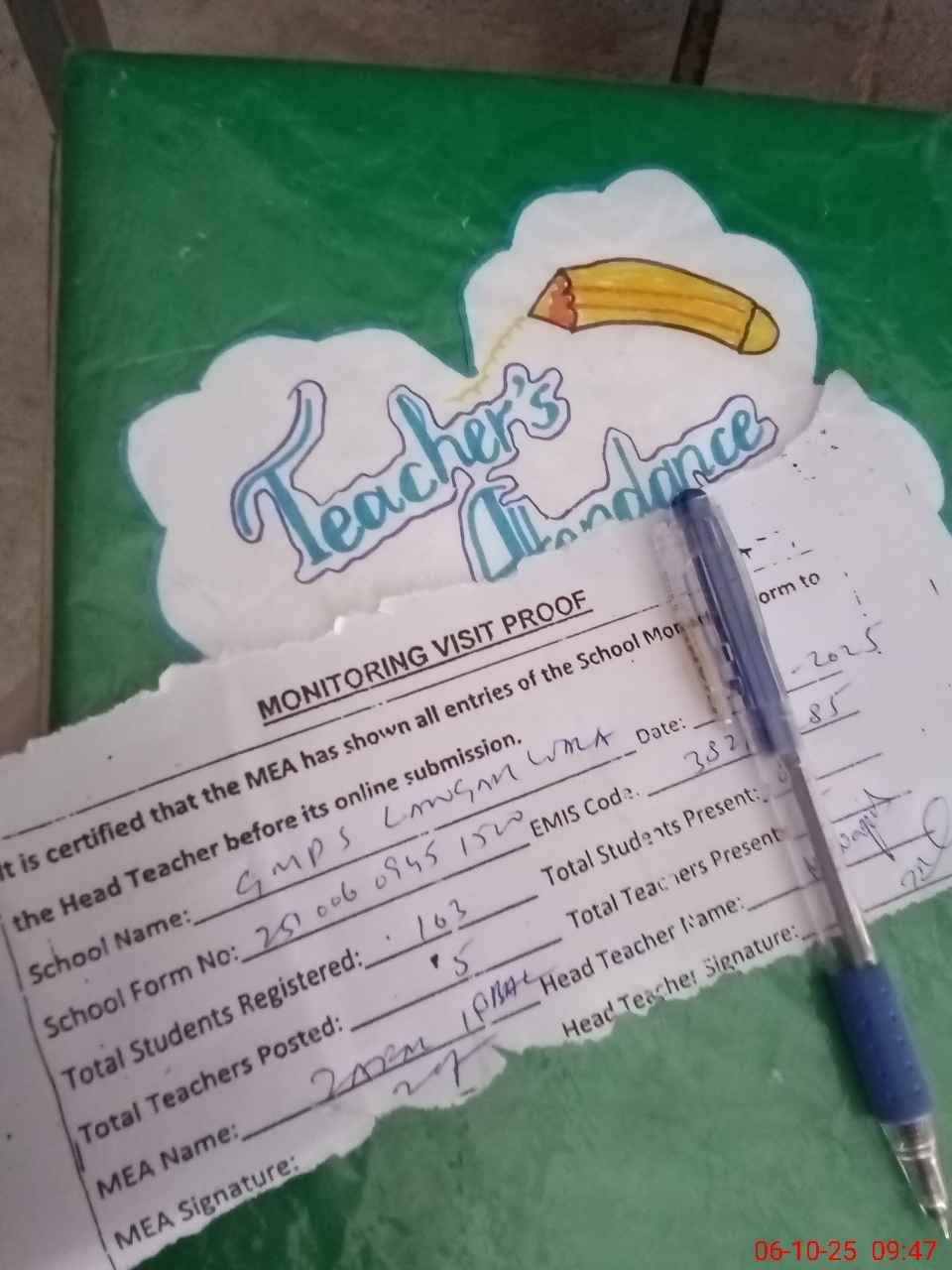 | Attendance Register | Head Teacher | MEA with School | Visit Proof |