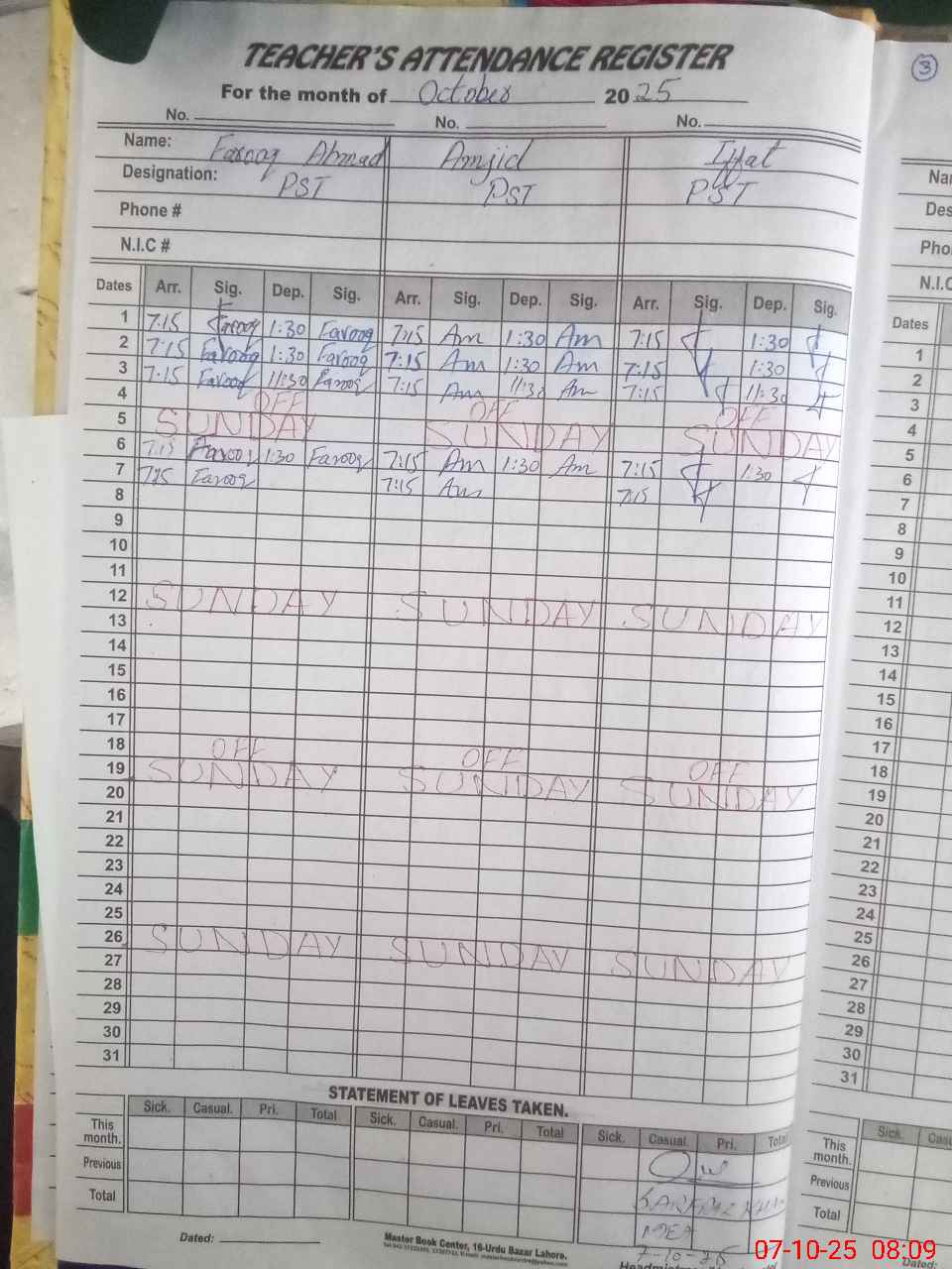 | CNIC | Full Name | Designation | R/C | Absence During Last Calender Month |