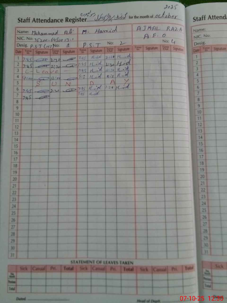 | CNIC | Full Name | Designation | R/C | Absence during last cal. month |