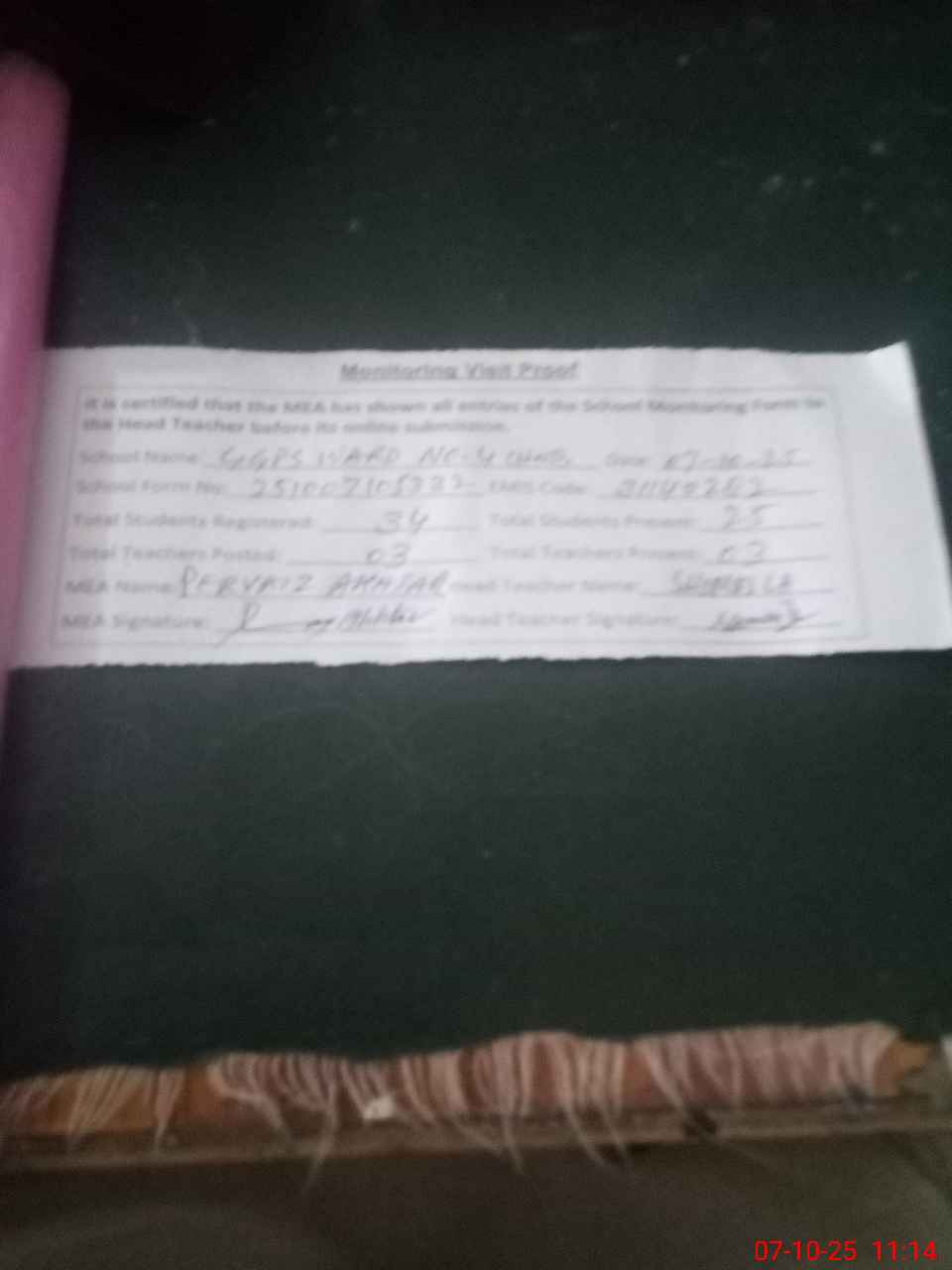 | Attendance Register | Head Teacher | MEA with School | Visit Proof |