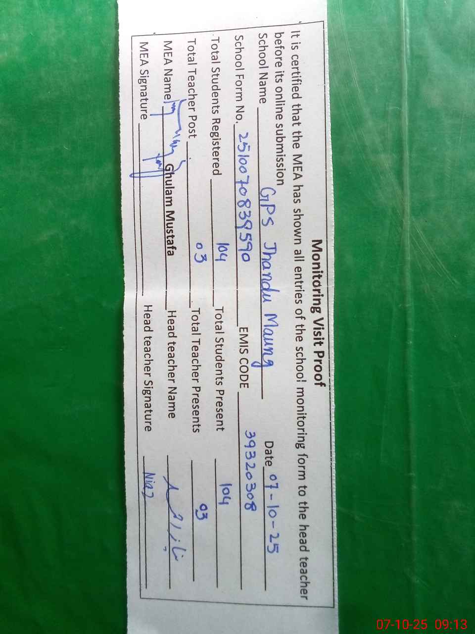 | Attendance Register | Head Teacher | MEA with School | Visit Proof |