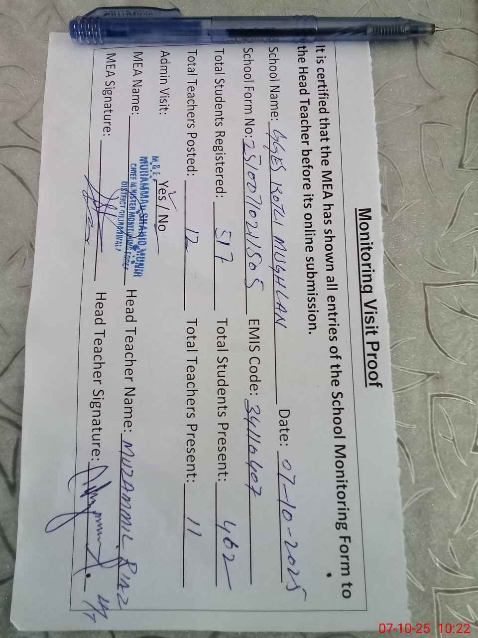 | Certified that this School was Inspected by the Undersigned MEA/DMO Today and the Information Stated Above is as Per Record. | |||||