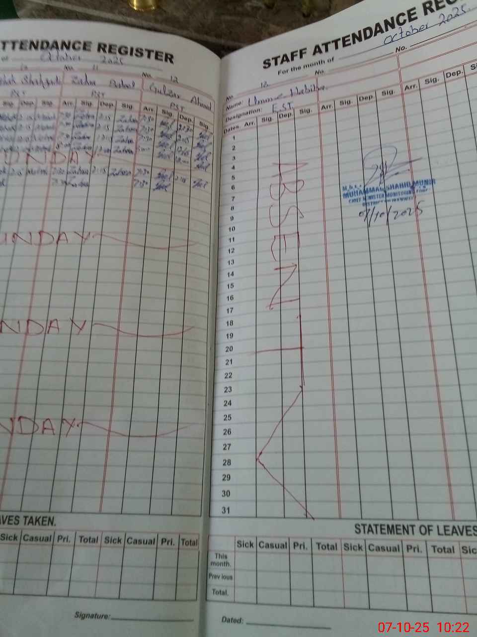 | 34**** | Um**** Ha**** | EST | Regular | 0 | 0 | 0 | 0 | 0 | 0 | 0 | 0 | 0 | Absent (Un-Authorized) |