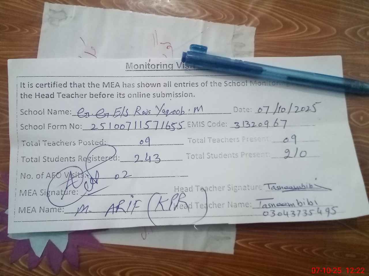 | Attendance Register | Head Teacher | MEA with School | Visit Proof |