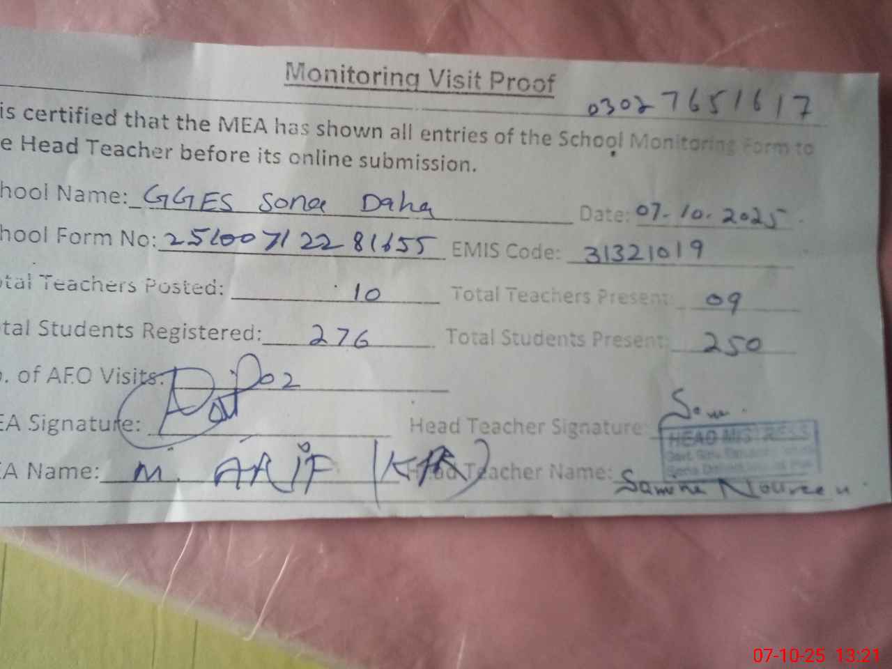 | Certified that this School was Inspected by the Undersigned MEA/DMO Today and the Information Stated Above is as Per Record. | |||||