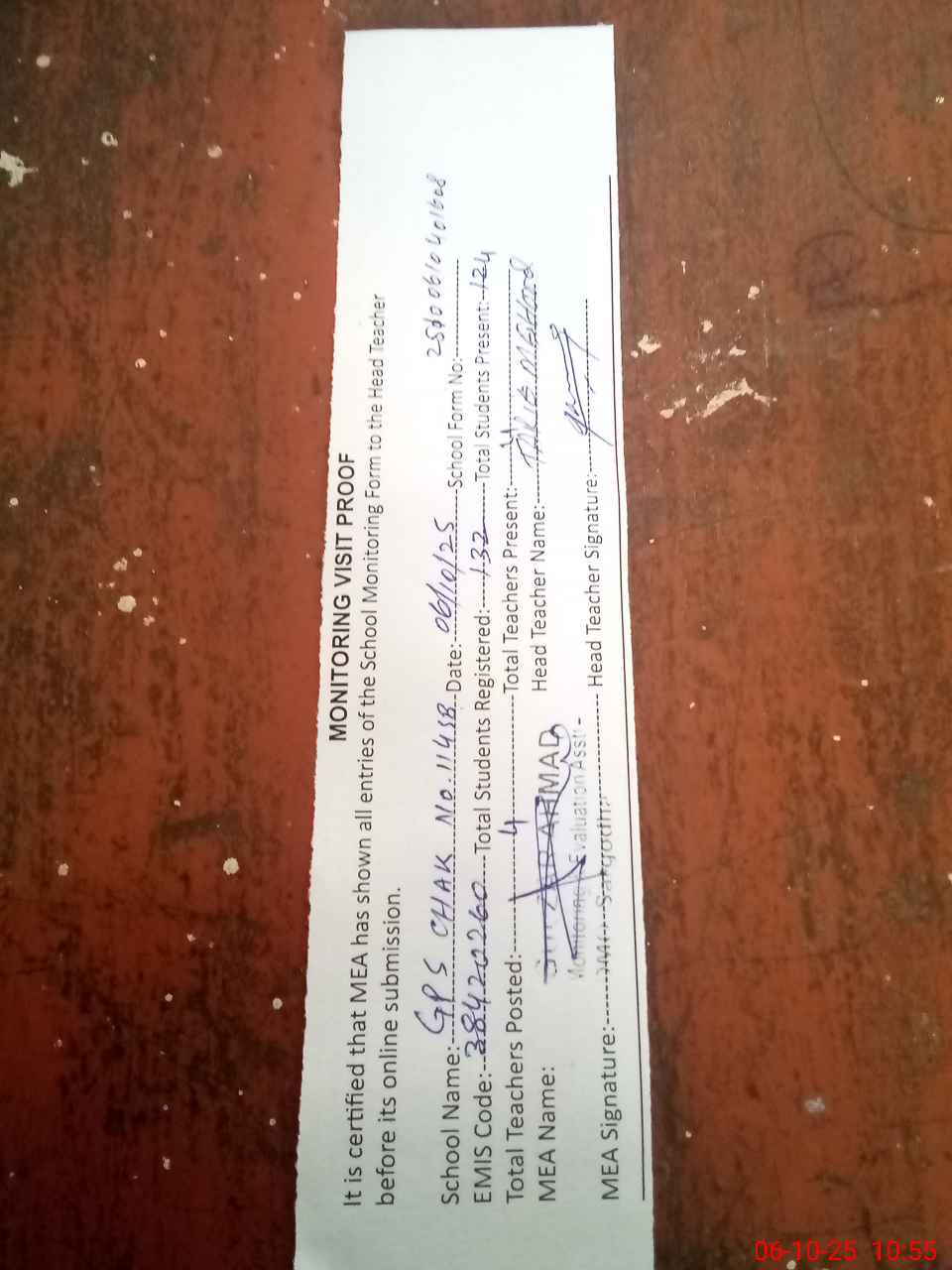 | Attendance Register | Head Teacher | MEA with School | Visit Proof |