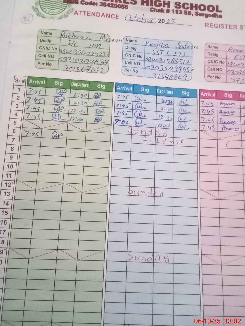 | CNIC | Full Name | Designation | R/C | Absence during last cal. month |