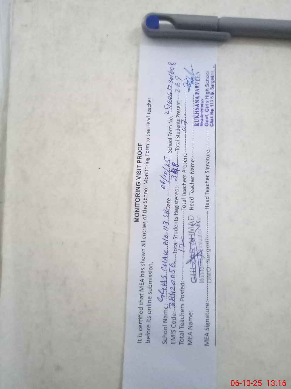 | Attendance Register | Head Teacher | MEA with School | Visit Proof |
