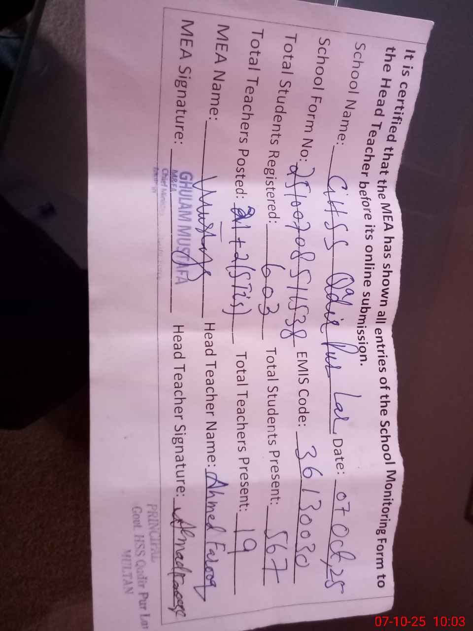 | Certified that this School was Inspected by the Undersigned MEA/DMO Today and the Information Stated Above is as Per Record. | |||||