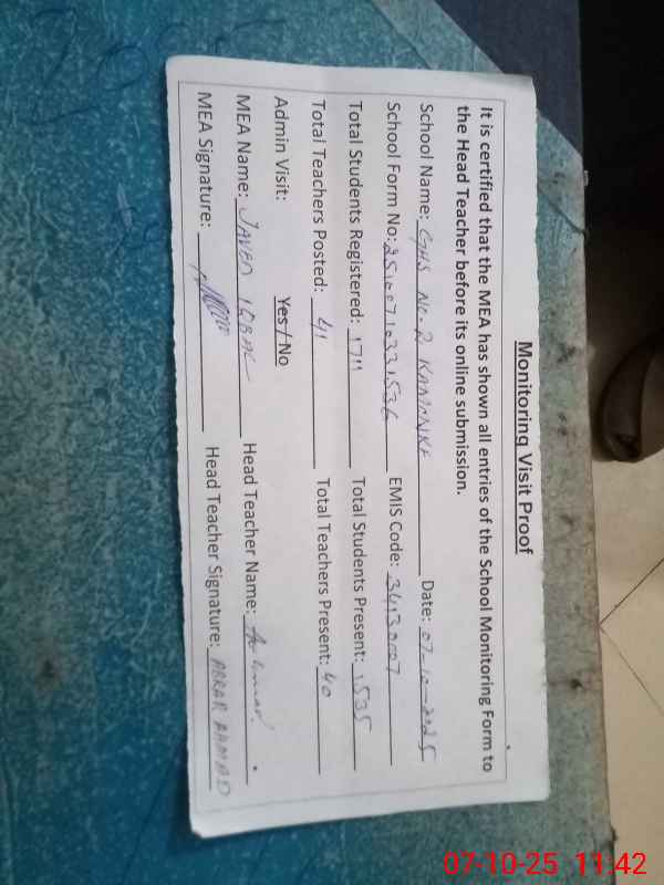 | Attendance Register | Head Teacher | MEA with School | Visit Proof |