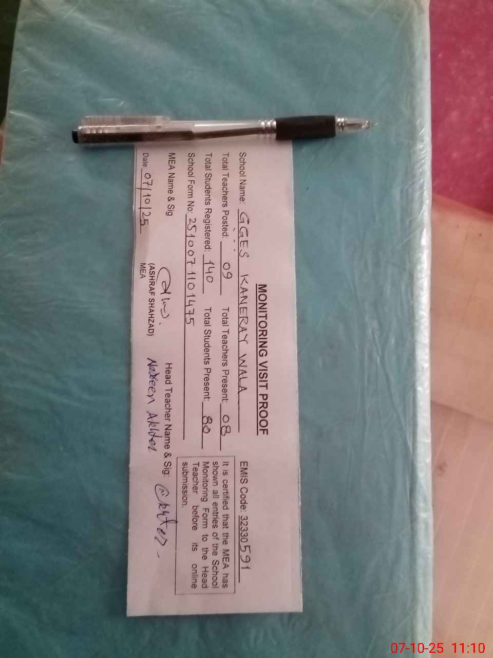 | Attendance Register | Head Teacher | MEA with School | Visit Proof |