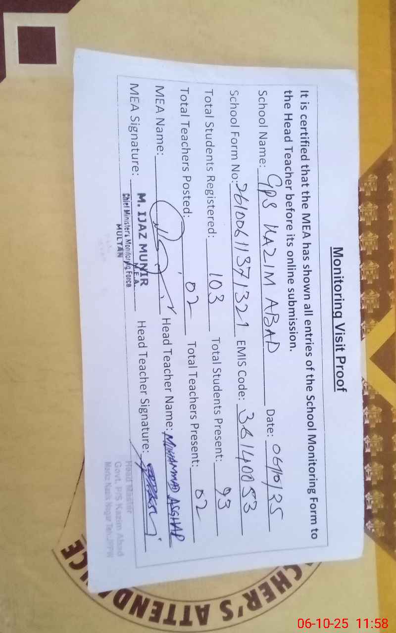 | EMIS Code: 36140053 | Name of School: GPS KAZIM ABAD CHAH ARY WALA | |||