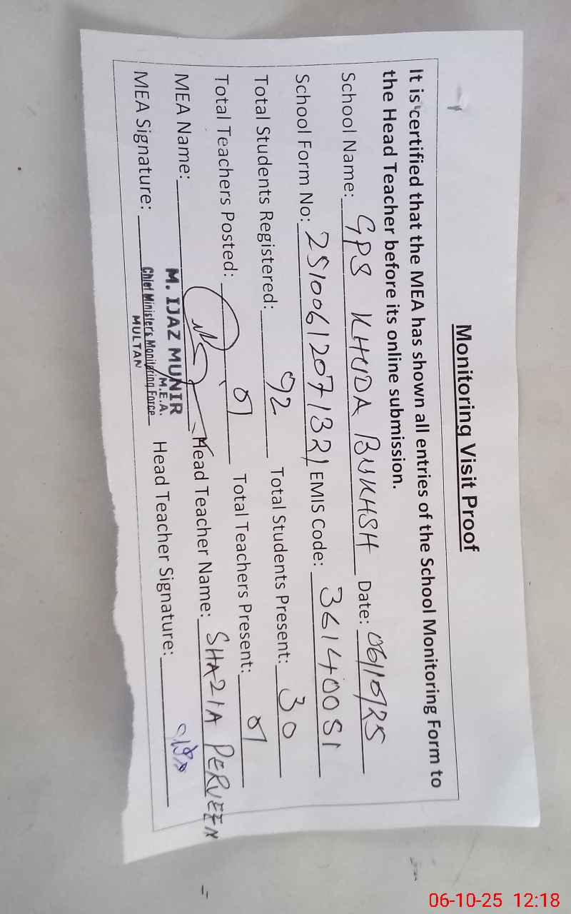 | EMIS Code: 36140051 | Name of School: GPS KHUDA BUKHSH WALA | |||