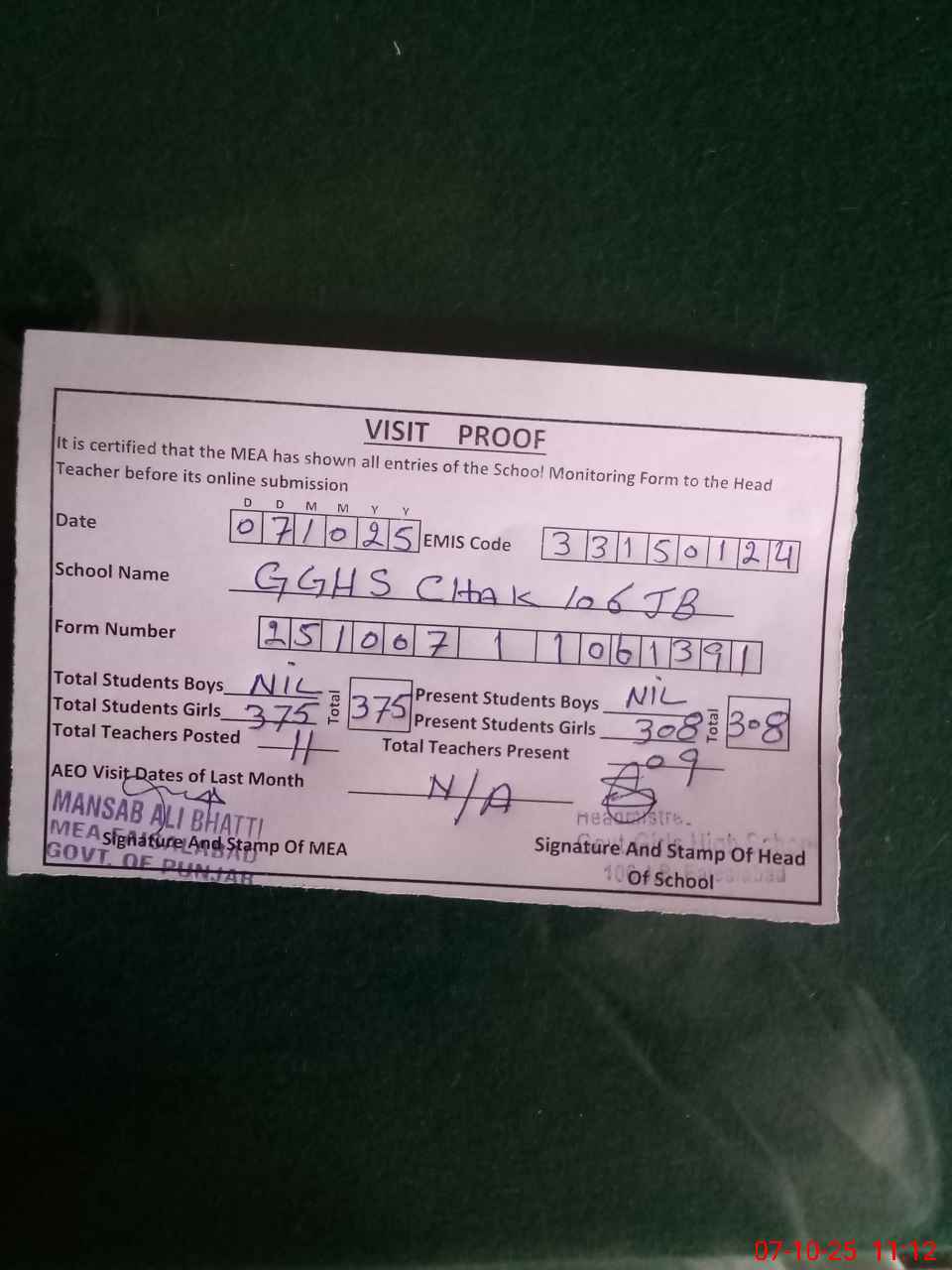 | EMIS Code: 33150124 | Name of School: GGHS CHAK 106 JB | |||