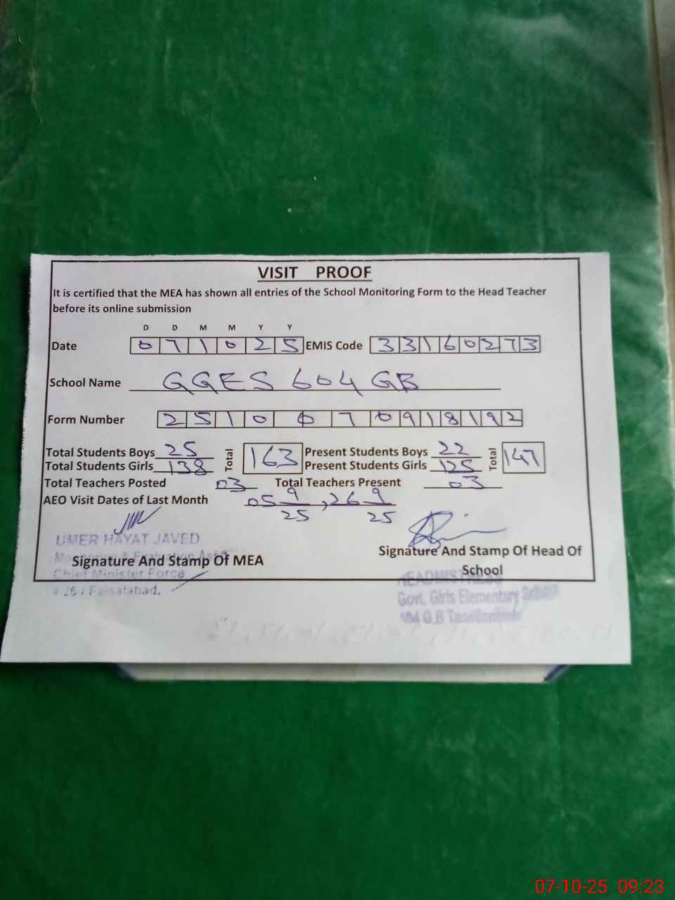 | Attendance Register | Head Teacher | MEA with School | Visit Proof |