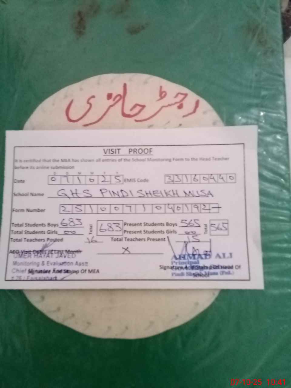 | Certified that this School was Inspected by the Undersigned MEA/DMO Today and the Information Stated Above is as Per Record. | |||||