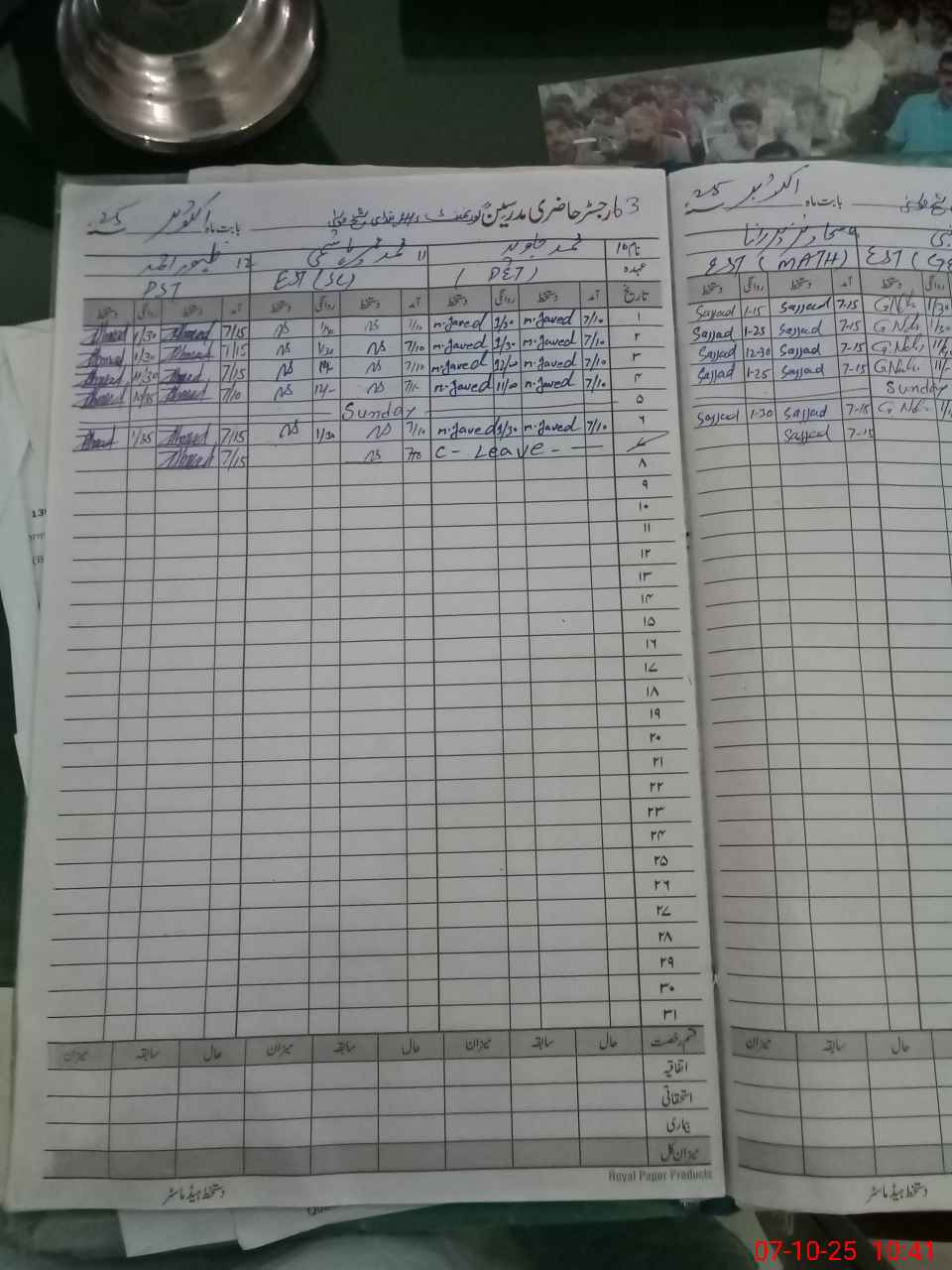 | CNIC | Full Name | Designation | R/C | Absence During Last Calender Month |