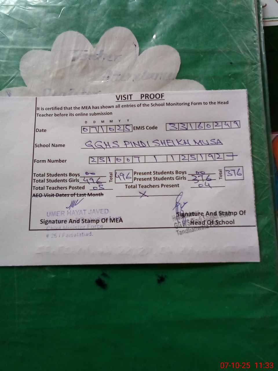 | EMIS Code: 33160249 | Name of School: GGHS PINDI SHEIKH MUSA TANDLIANWALA | |||