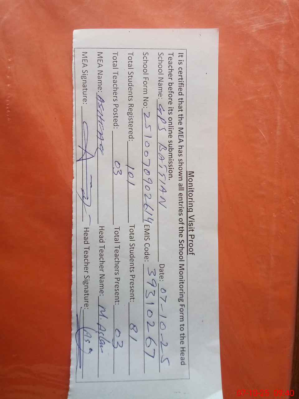 | Attendance Register | Head Teacher | MEA with School | Visit Proof |