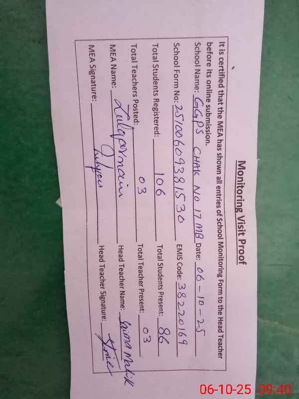| EMIS Code: 38220169 | Name of School: GGPS CHAK NO 17 MB | |||