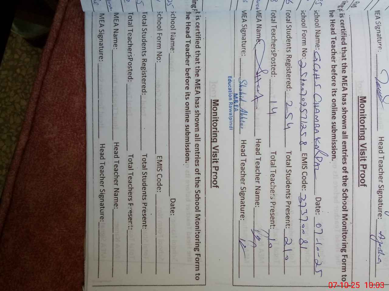 | Certified that this School was Inspected by the Undersigned MEA/DMO Today and the Information Stated Above is as Per Record. | |||||