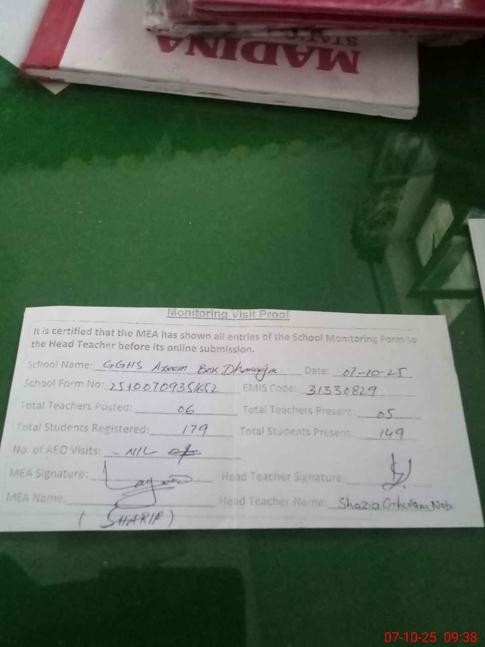 | EMIS Code: 31330829 | Name of School: GGHS AZEEM BUKHSH DHAREEJA | |||