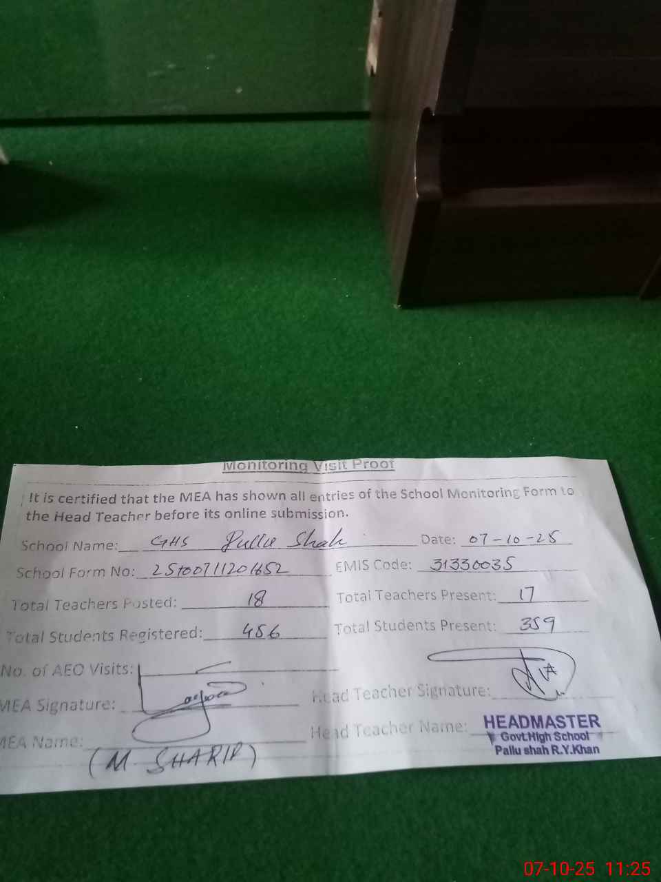 | Certified that this School was Inspected by the Undersigned MEA/DMO Today and the Information Stated Above is as Per Record. | |||||