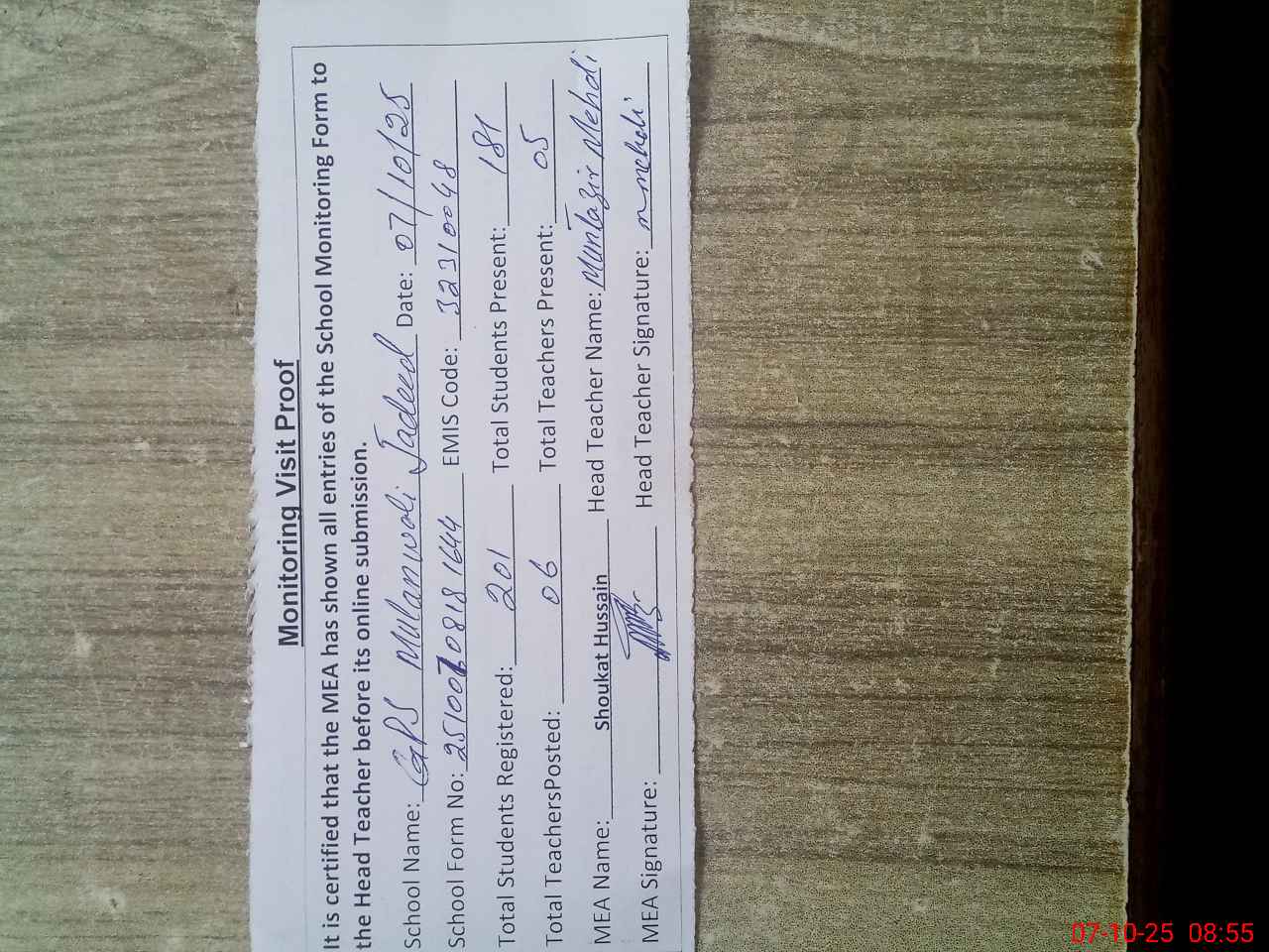 | Certified that this School was Inspected by the Undersigned MEA/DMO Today and the Information Stated Above is as Per Record. | |||||