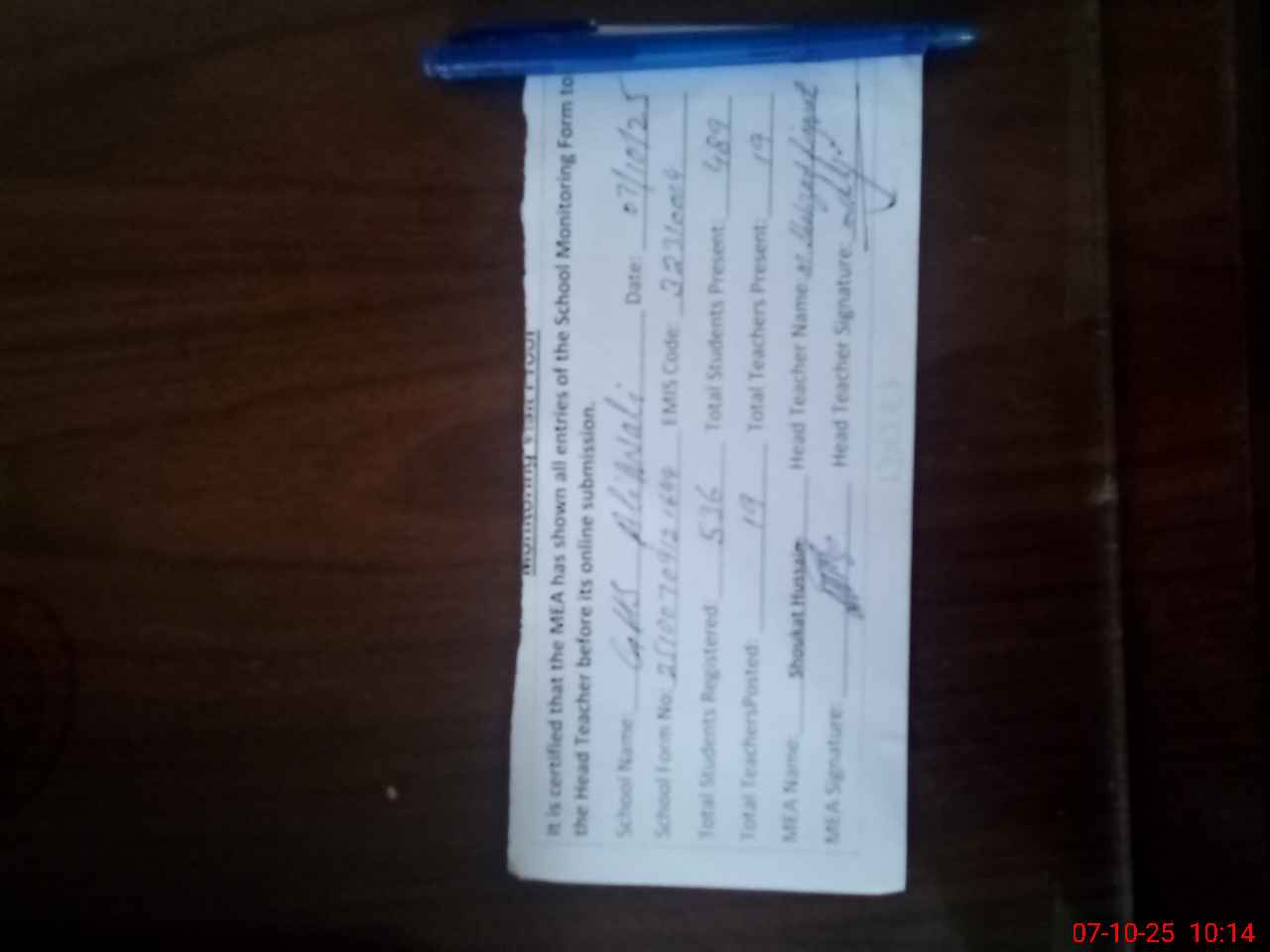 | Name: MU**** SH**** LI**** Designation: (School Headmaster's/Headmistress's) HM Phone/Cell Number: 03**** |